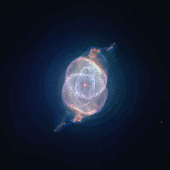 This nebulas dying central star may. This NASAESA Hubble Space Telescope image shows one of the most complex planetary nebulae ever seen NGC 6543 nicknamed the Cats Eye Nebula Hubble reveals surprisingly intricate structures including concentric gas shells jets of high-speed gas and unusual shock-induced knots of gas. Its outer envelope has been expelled leaving a hot white star that ionizes the expelled gaseous envelope causing it to glow.